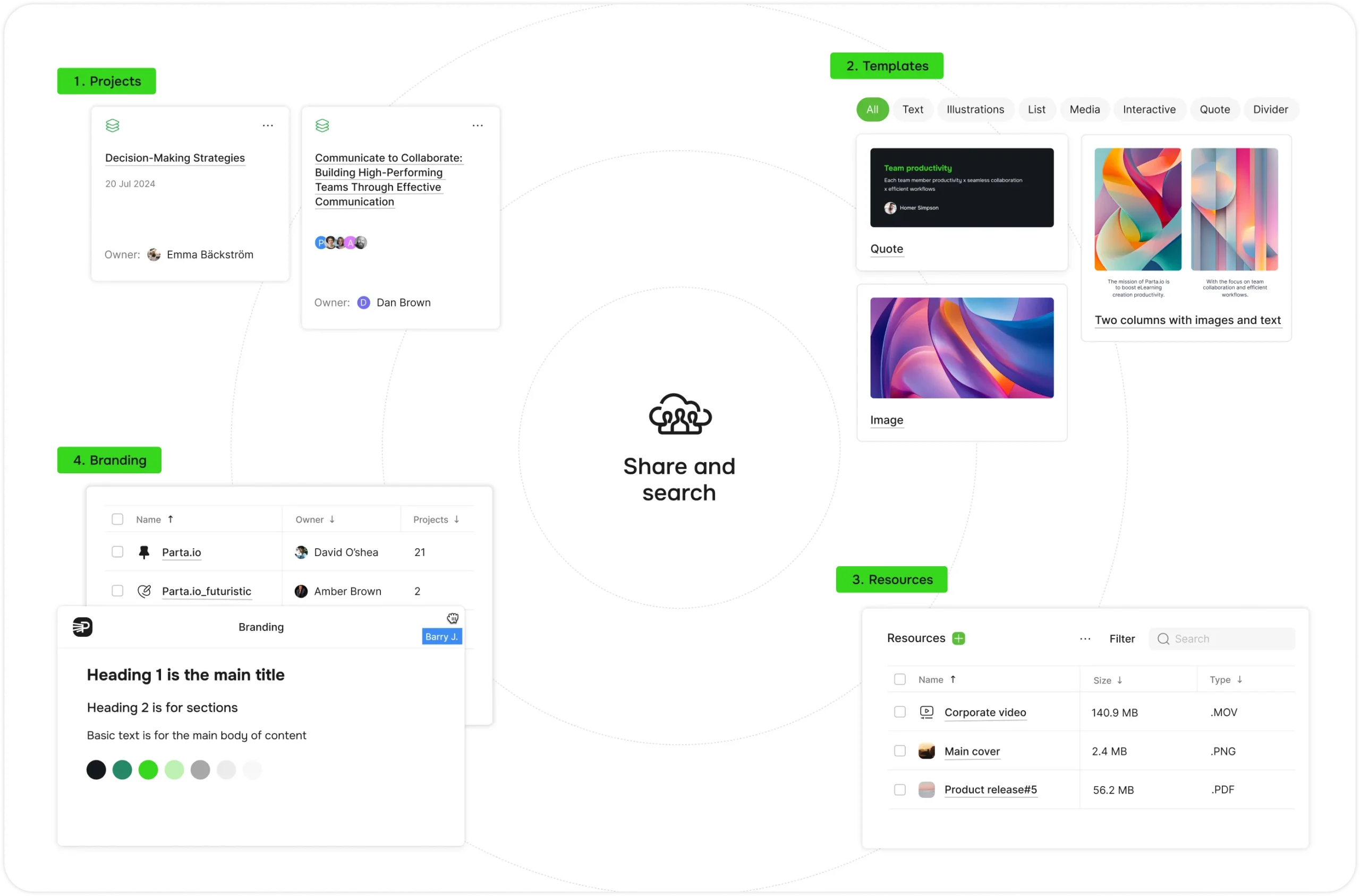 Share courses, branding themes, media, and templates effortlessly, uniting all team members in one collaborative space.