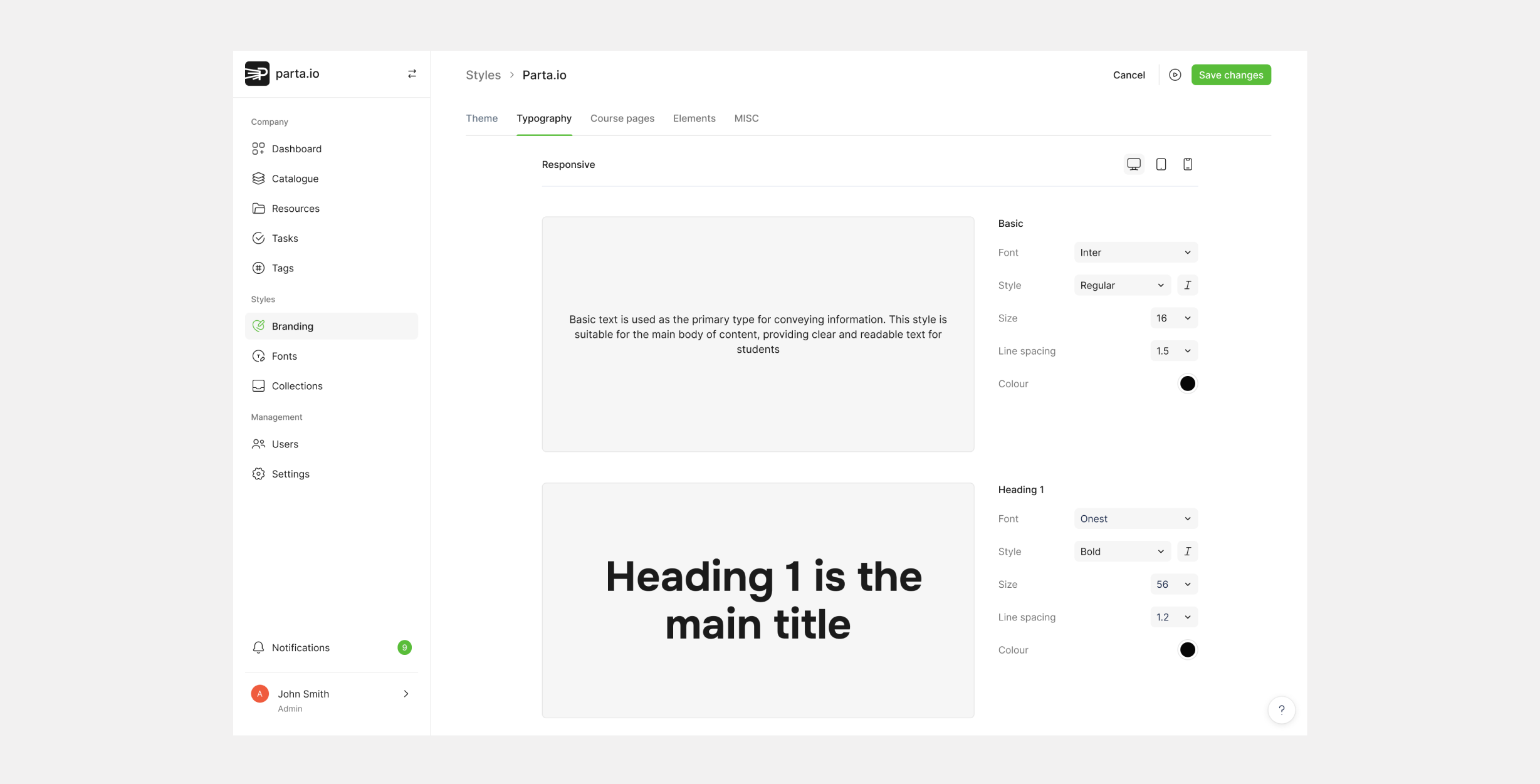 Back to all articles Back to all articles Share product releases 19 Jun 2024 Release 2.41 With this letter, we’re excited to begin sharing Parta.io product updates with our community! Welcome to our first one! We’re committed to continuously improving Parta.io with at least 15 releases per year. In the latest release, we focused on simplifying platform navigation and editing experience, while also introducing some helpful new features. Let’s see the details below: Streamlined Course Outline Experience We’ve simplified the course outline making it much easier to create your course structure and navigate seamlessly from the outline to the editor. Product Tours We’ve introduced an intuitive product tour to help new users navigate the platform even if they skip onboarding with the Parta.io team. Extended Branding for Course Navigation We’ve enhanced branding options! You can now customize your course’s Navigation Menu with features like fixed or sliding menus, custom backgrounds, left or right placement, and custom icons for each section. Extended Branding with Font Management In addition to uploading custom fonts you can now customize fonts for any course element and screen size in your Branding Theme. For example, set the font size for your accordion on the web version and adjust it for mobile separately. In-line Annotation within Course Text Add clear definitions and explanations directly within the course text. This feature helps reduce the need for learners to refer to the glossary frequently minimizing distractions. Rich-text Settings for All Elements You asked, we delivered! You can now fine-tune the text formatting of all course elements. Select the desired text and use the popup menu to access rich text settings. Converting Text into Code For those building courses for IT or embedding code, you’ll love this feature! You can now convert your text into code snippets easily by activating Rich-Text settings. It transforms into code with the IBM Plex Mono font for clear syntax display. Further customize its appearance with rich-text options (font color, background, etc.)This makes it easier to present clean syntax examples and commands without needing separate code blocks. Enjoy! Parta.io Team Share